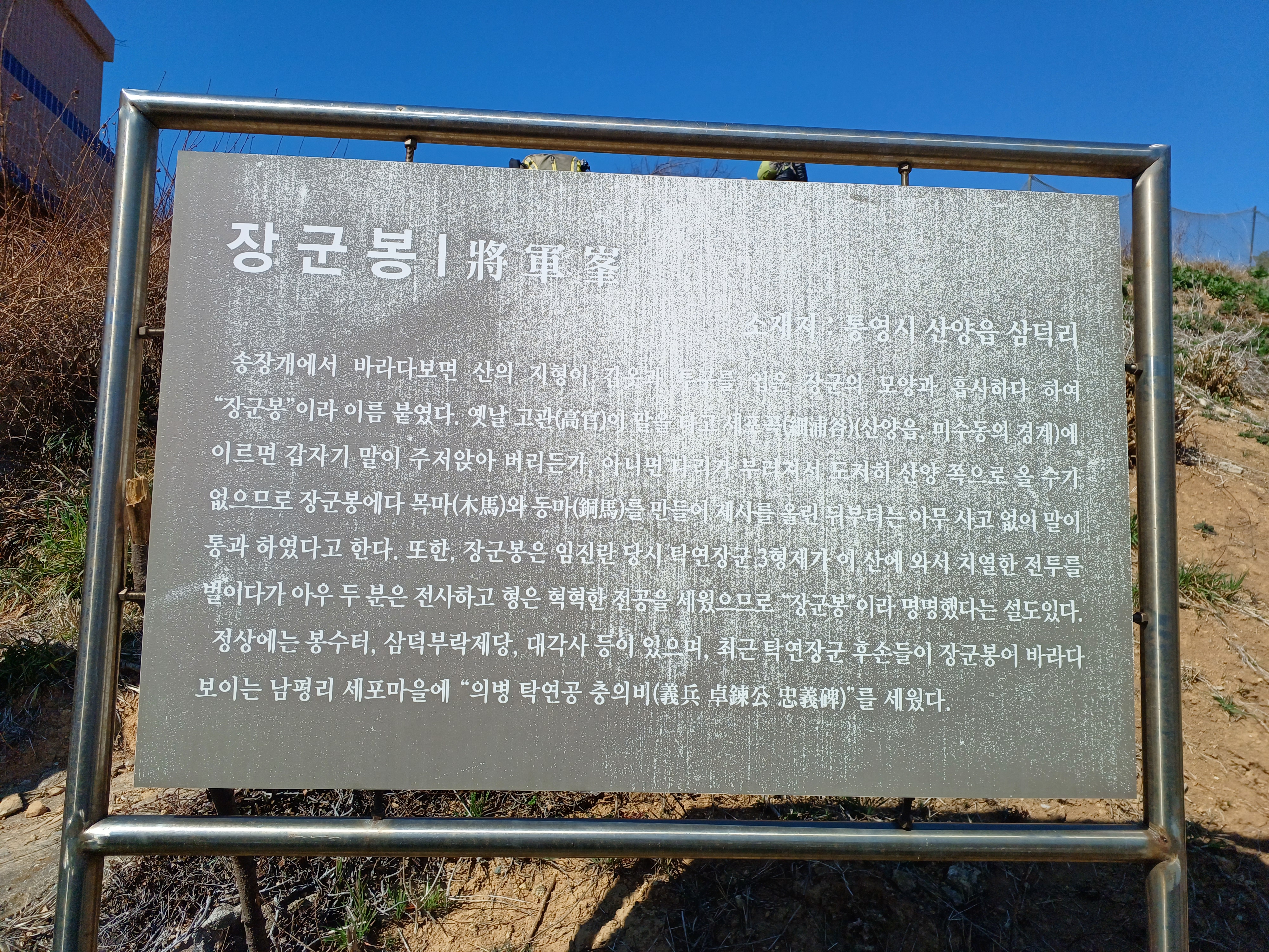 ♣"장군봉" 은 경상남도 통영시 산양읍 삼덕리에 있는 산으로 송장개에서 바라다 보면 '지형이 갑옷과 투구를 입은 장군의 모습과 흡사' 하다 하여 '장군봉' 이라 이름 붙였다. 옛날 고관이 말을 타고 세포곡에 이르면 갑자기 말이 주저 앉아 버리든가 아니면 다리가 부러져서 도대체 산양쪽으로 올 수가 없으므로 '장군봉' 에다 목마와 동마를 만들어 제사를 올리고서 부터는 아무 사고 없이 말이 통과 하였다고 한다. 또한 '장군봉' 은 임진왜란 당시 탁연장군 3형제가 이 산에 와서 치열한 전투를 벌이다가 아우 두분은 전사하고 형은 혁혁한 전공을 세웠으므로 '장군봉' 이라 명명 했다는 설도 있다.